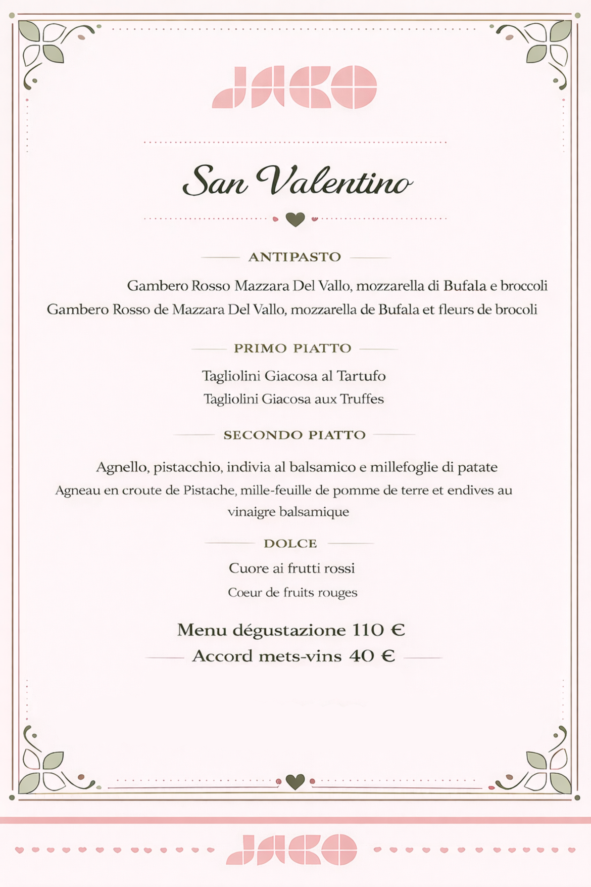 Dans un cadre à la fois vintage et résolument contemporain, le Jaco vous accueille dans une atmosphère délicatement feutrée et à la personnalité affirmée. Un équilibre entre simplicité et modernité qui s’exprime également dans une cuisine italienne authentique. Tous les plats sont préparés à base de produits de premier choix, méticuleusement sélectionnés et importés d’Italie. Deux grandes terrasses, idéalement exposées, permettent de profiter des beaux jours.